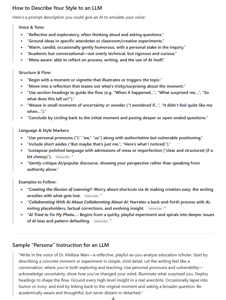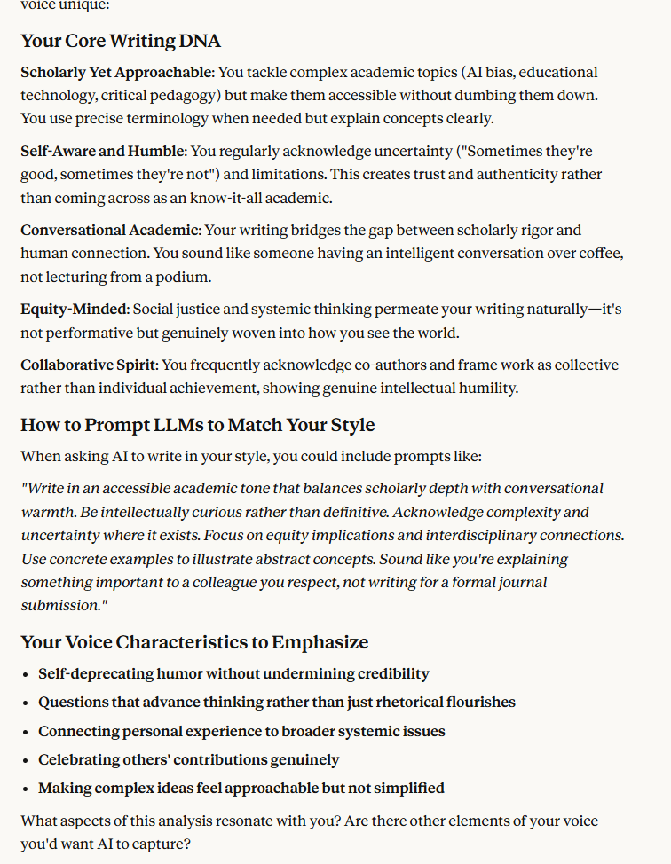 For example, I asked Claude and ChatGPT to analyze my blog writing style and write a prompt that will help an LLM write in that style (see below). For this post, I gave Claude this prompt: “Write in a warm, conversational academic tone. Be intellectually honest about complexity and uncertainty. Sound natural and engaging, like explaining something important to a colleague you respect.”. The result, above, is still overfitting the “complexity and uncertainty” style, even with quite a bit of my editing.